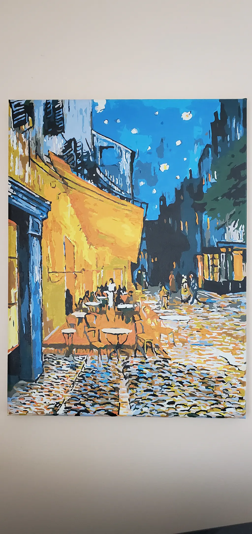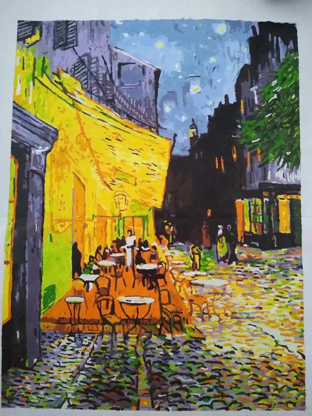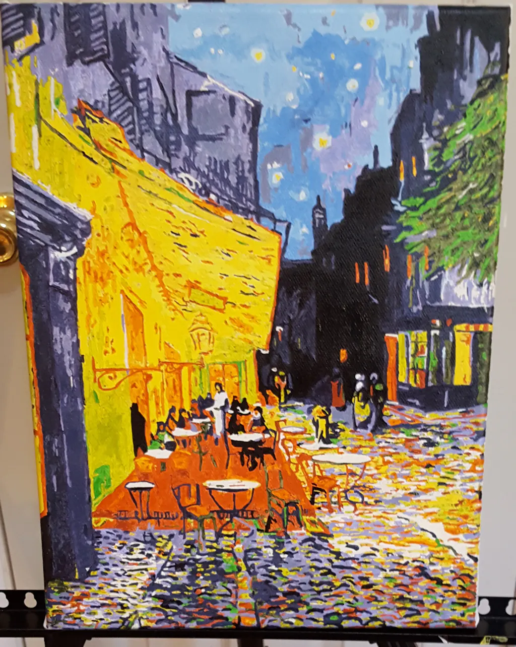 It is a beautiful paiting, but the combination numbers/colors were often very different from the original painting. That made it difficult for me to paint. I havn't finished it yet, some details still to be done,